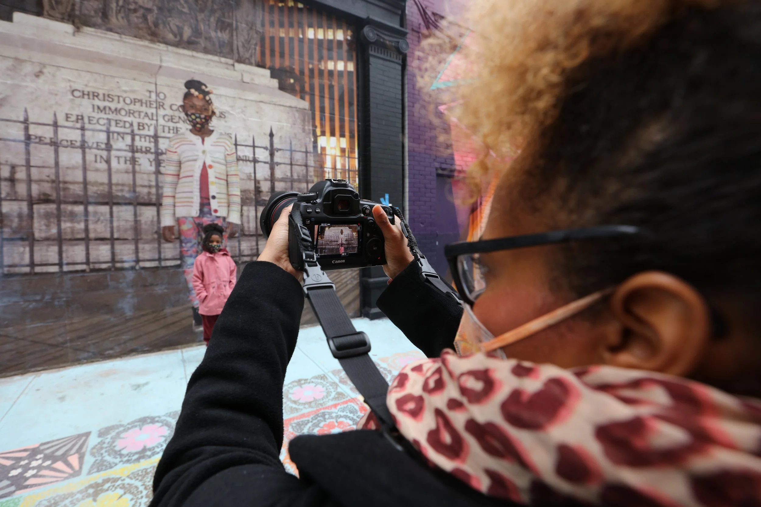 Will You Be My Monument is a collaboration between writer Salamishah Tillet of New Arts Justice at Rutgers University - Newark, designer Chantal Fischzang, and photographer Scheherazade Tillet. This public art installation was inspired by the City of Newark’s removal of the Columbus statue in Washington Park on June 25, 2020. Featuring a photograph by Scheherazade Tillet of Faa’Tina, an eight-year-old Black girl who celebrated her eighth birthday in Washington Park that night, this work is also made up of reflective typography and acrylic mirrors that Chantal Fischzang designed to structurally connect the installation with the pedestal of the original monument and to reflect the diversity and vibrancy of the people of Newark. The sheer size of this installation -- a four story building -- and its aesthetic gravitas greatly adds to the debates about monuments, racial representation, and social justice, while also enhancing contemporary conversations about the ongoing (in)visibility of Black girls and young women in the United States.